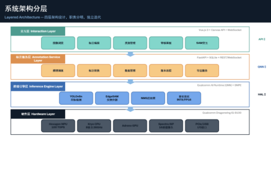 本文详细介绍了基于高通IQ-9100边缘计算平台搭建图像检测半自动化标注系统的完整实践。系统通过在IQ-9100的Hexagon NPU上部署YOLOv8n目标检测模型和EdgeSAM分割辅助模型,实现了高效的“AI预标注+人工精修”工作流。